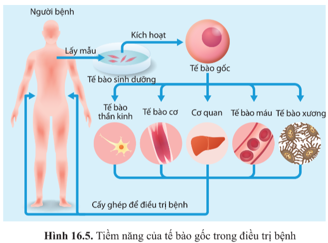 Quan sát hình 16.5 và cho biết tế bào gốc được kích hoạt từ tế bào sinh dưỡng có thể biết hóa để tạo thành các đồng tế bào nào? Nếu dùng dòng tế bào gốc này để điều trị cho người khác thì có thể gặp những khó khăn gì?
