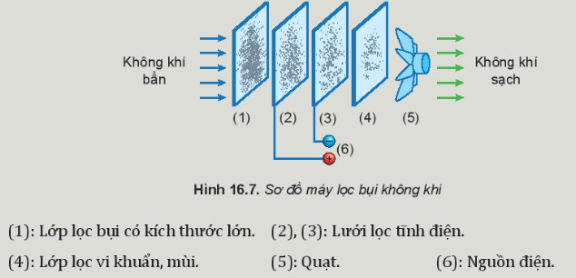 Trình bày được nguyên tắc hoạt động của máy lọc không khí trong gia định dựa trên sơ đồ hình 16.7.