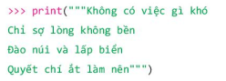 1. Ngoài cách viết xâu kí tự giữa cặp dấu nháy đơn hoặc nháy kép còn có thể viết giữa cặp ba dấu nháy kép. Nếu một xâu được viết giữa cặp ba dấu nháy kép thì chúng ta có thể dùng phím Enter để xuống dòng ở giữa xâu. Hãy thực hiện lệnh sau và quan sát kết quả: