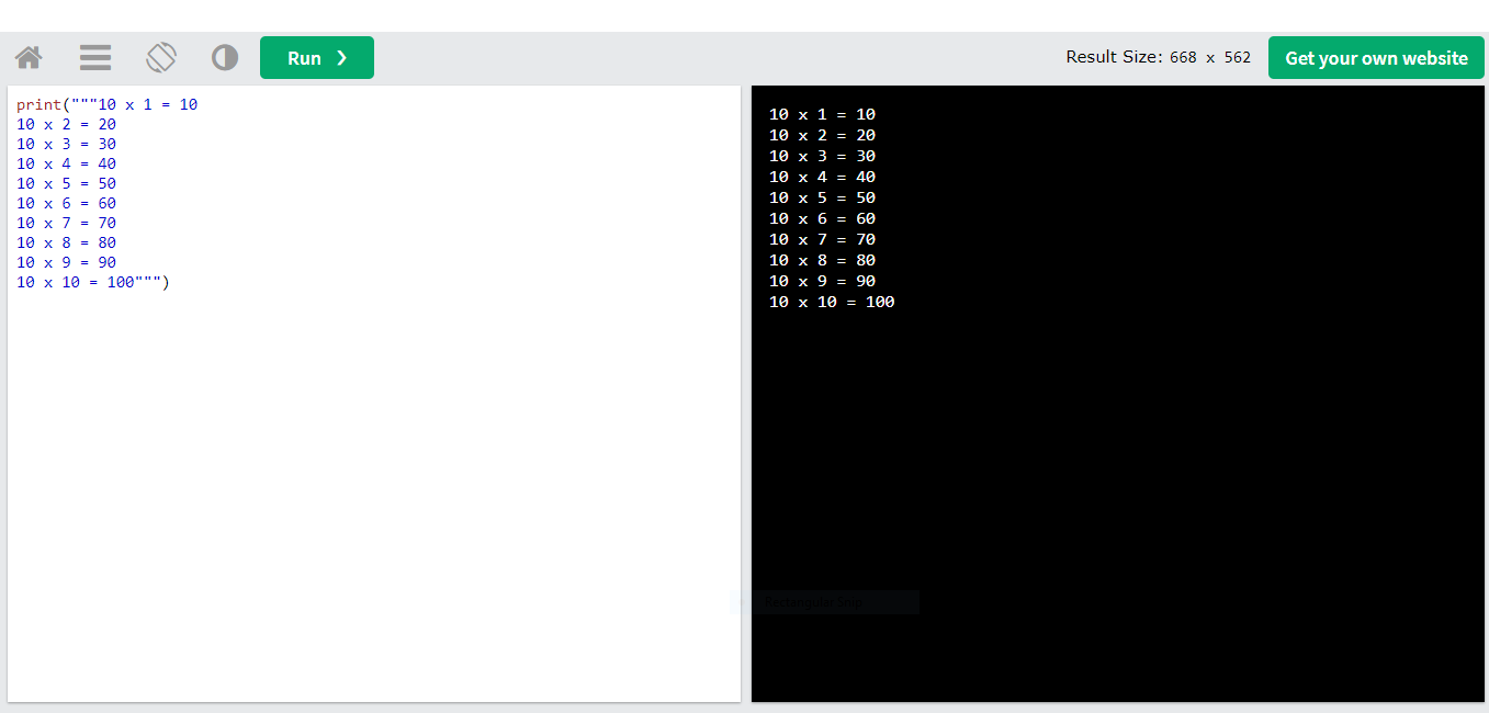 2. Viết chương trình Python in ra màn hình bảng nhân trong phạm vi 10.