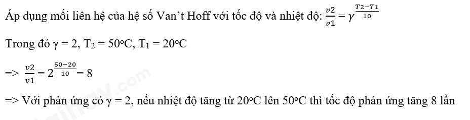 | 10. Với phản ứng có γ = 2, nếu nhiệt độ tăng từ 20oC lên 50oC thì tốc độ phản ứng tăng bao nhiêu lần? |