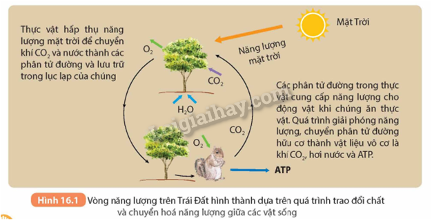 1. Vòng năng lượng giữa các vật sống là quá trình chuyển đổi năng lượng từ nguồn thực vật (thông qua quá trình quang hợp) cho đến các động vật. Ở quá trình quang hợp, thực vật hấp thụ năng lượng mặt trời, chuyển hóa năng lượng mặt trời thành hóa năng lưu trữ trong lục lạp của chúng. Thức ăn của động vật thường là thực vật hoặc các động vật khác. Các động vật ăn thực vật để lấy năng lượng và các chất dinh dưỡng cho sự sinh trưởng, phát triển và vận động. Động vật lấy glucose từ quá trình phần giải thức ăn. Nhở quá trình hô hấp với sự tham gia của khí oxygen mà các phần tử chất hữu cơ (chủ yếu là glucose) được phần giải thành khí CO, và nước, đồng thời tạo ra năng lượng ATP. Thực vật lại bắt đầu hấp thụ năng lượng mặt trời để chuyển khí CO, và nước thành phân tử đường hữu cơ.
