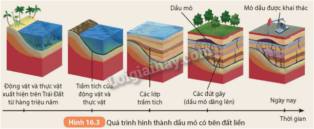 1. Hình 16.3 minh họạ quá trình hình thành dầu mỏ có trên đất liên. Từ vài trăm triệu năm trước, một lượng lớn thực vật và xác sinh vật biển tích tụ dưới đáy đại dương tạo thành trầm tích của động vật và thực vật. Trong hàng triệu năm tiếp theo, lớp trầm tích này bị biến đổi bởi vi khuẩn và chìm sâu hơn. Trải qua sự gia tăng nhiệt độ và áp suất, ở độ sâu khoảng một vài kilômét dưới áp suất lớn, dần dần các lớp trầm tích biến thành bùn đen, dầu mỏ. Sau đó, dựa vào các vết đứt gãy của các lớp đá, dầu mỏ dần nổi lên, tích tụ trong các túi đá, trở thành mỏ dầu.