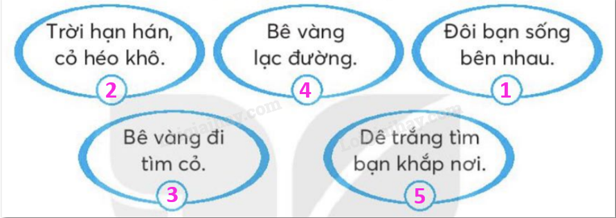 Sắp xếp các sự việc dưới đây theo trình tự câu chuyện trong bài đọc. Đánh dấu vào ô trống trước các từ ngữ chỉ tình cảm của dê trắng dành cho bê vàng. Viết lại những từ ngữ chỉ hoạt động của bê vàng và dê trắng trong khổ thơ cuối. Viết một câu có sử dụng từ ngữ vừa tìm được ở bài tập 3. Viết 2 – 3 câu cho đoạn kết của câu chuyện trong bài thơ Gọi bạn theo ý của em.