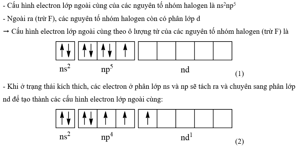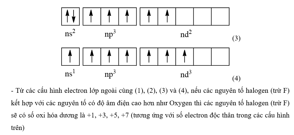 – Từ các cấu hình electron lớp ngoài cùng (1), (2), (3) và (4), nếu các nguyên tố halogen (trừ F) kết hợp với các nguyên tố có độ âm điện cao hơn như Oxygen thì các nguyên tố halogen (trừ F) sẽ có số oxi hóa dương là +1, +3, +5, +7 (tương ứng với số electron độc thân trong các cấu hình trên)