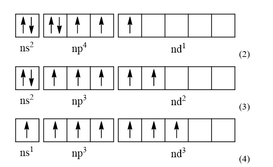 – Khi ở trạng thái kích thích, các electron ở phân lớp ns và np sẽ tách ra và chuyên sang phân lớp nd để tạo thành các cấu hình electron lớp ngoài cùng: