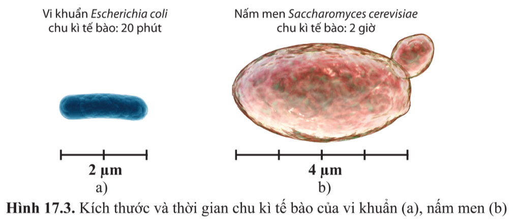 Hình 17.3 cho biết kích thước và thời gian chu kì tế bào của E. coli và S. cerevisiae. Em có nhận xét gì về mối liên hệ giữa hai thông số đó? Giải thích.