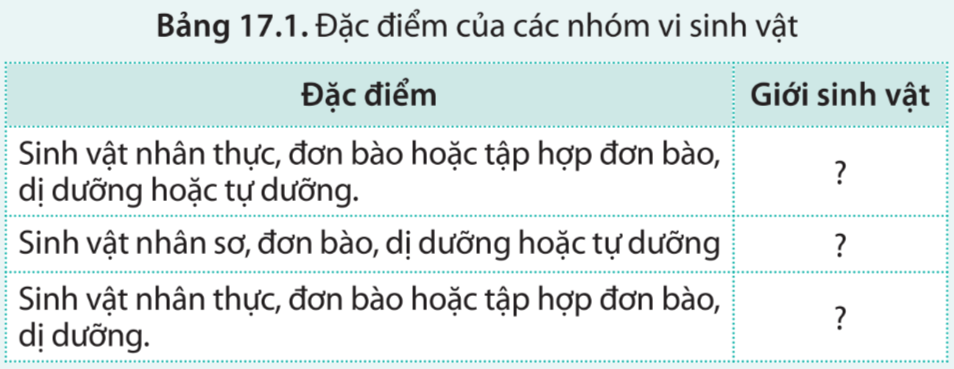 Cho biết vi sinh vật có nhóm đặc điểm liệt kê ở bảng 17.1 thuộc giới nào trong 3 giới sau: Khởi sinh, Nấm, Nguyên sinh.