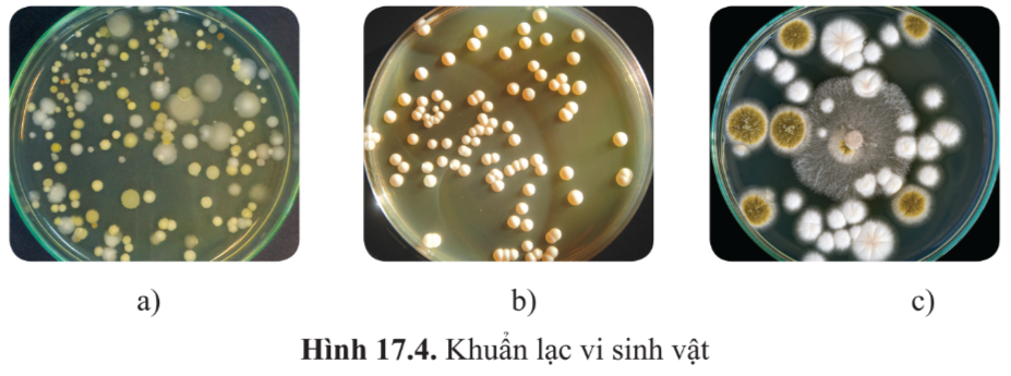 Em hãy cho biết khuẩn lạc vi khuẩn, nấm mốc và nấm men tương ứng với ảnh nào trong các ảnh ở hình 17.4.
