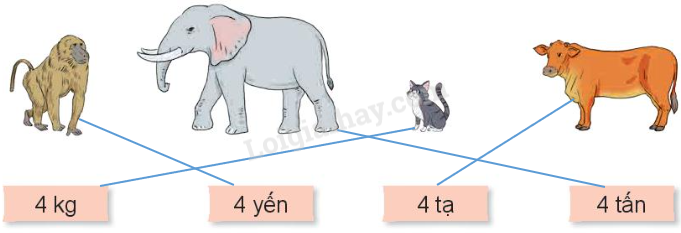 Quan sát tranh rồi nối mỗi con vật với cân nặng thích hợp.