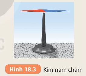 – Đặt một kim nam châm cân bằng trên một mũi nhọn (kim nam châm tự do) (Hình 18.3), quan sát hướng chỉ của hai đầu kim khi kim đã nằm cân bằng.