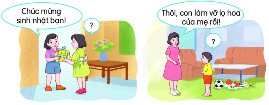 – Tranh 2: Em chơi bóng làm vỡ lọ hoa ở phòng khách, em sẽ xin lỗi mẹ như thế nào?