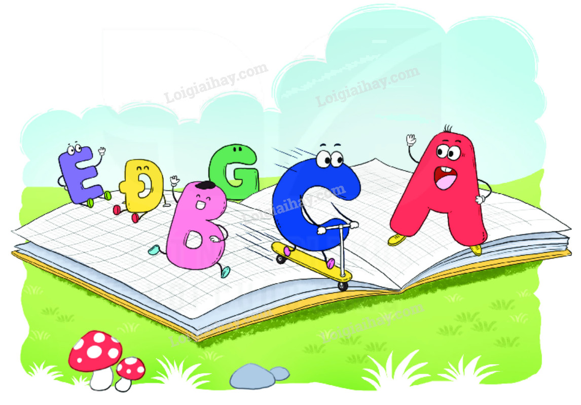 Bức tranh thứ nhất: Chữ A đứng đầu tiên đang hô gọi các chữ cái tiếp theo cùng đi theo mình để cùng hợp lực làm việc bên trang sách, tất cả các chữ cái đều hào hứng, vui vẻ.