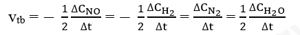 Gọi ∆CNO, ∆CH2, ∆CN2, ∆CH2O lần lượt là biến thiên nồng độ các chất NO, H2, N2 và H2O trong khoảng thời gian . Tốc độ trung bình của phản ứng được tính theo biểu thức:
