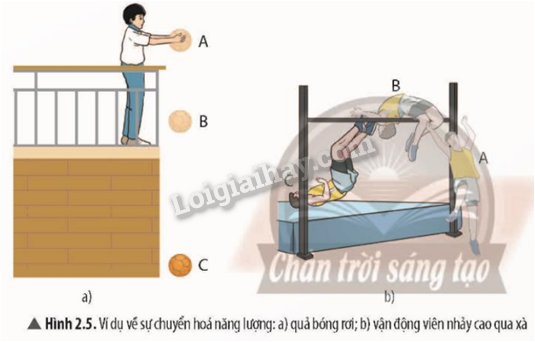 Mô tả sự chuyển hóa giữa động năng và thế năng trong chuyển động của quả bóng rơi (Hình 2.5a) và vận động viên nhảy cao qua xà (Hình 2.5b, không xét giai đoạn chạy đà).