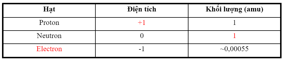 Hạt mang điện tích dương là proton, hạt electron mang điện tích âm, hạt neutron không mang điện. Số hạt mang điện tích dương bằng số hạt mang điện tích âm, tức số hạt proton bằng số hạt electron.