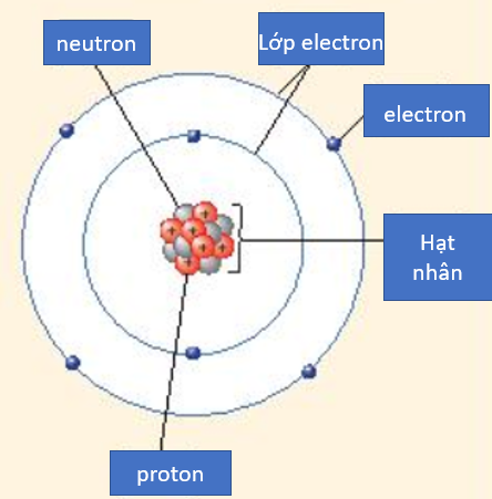 + Vỏ nguyên tử: Gồm các electron (e) mang điện tích âm được sắp xếp thành từng lớp và chuyển động xung quanh hạt nhân