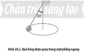 Một trái bóng được buộc vào một sợi dây và quay tròn đều trong mặt phẳng ngang như Hình 20.2. Trái bóng quay một vòng trong 1 s với tốc độ 0,5 m/s. Tính bán kính quỹ đạo và chiều dài L của sợi dây, biết góc hợp bởi dây và phương thẳng đứng bằng 300.