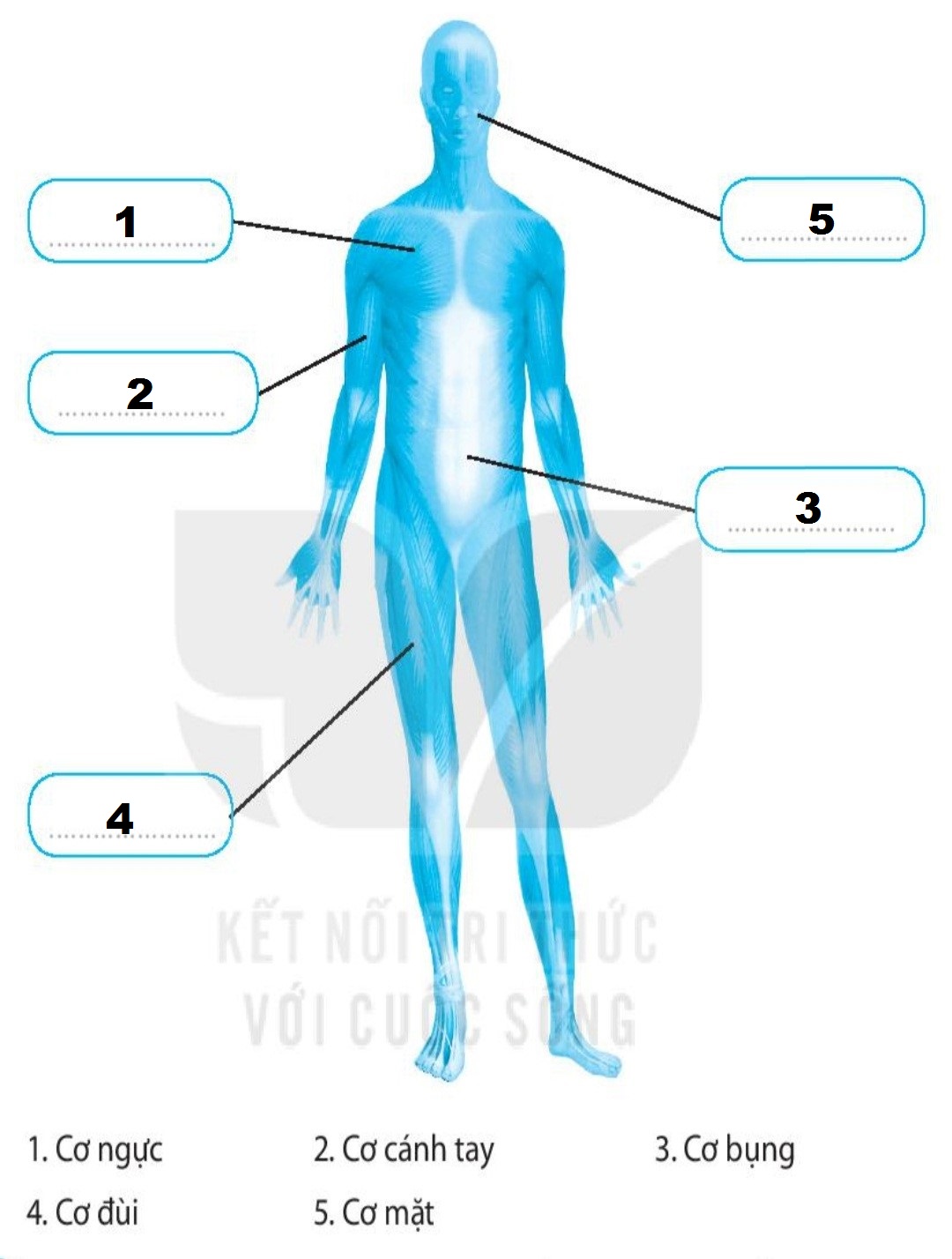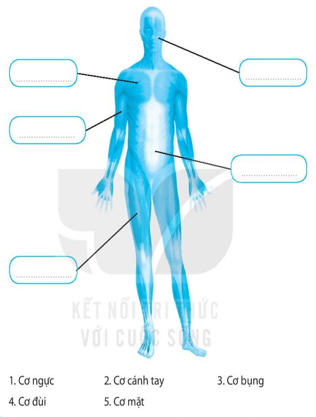 Cơ quan vận động gồm (1. Bộ xương)  và hệ cơ. (4. Khớp) nối giữa các (2. Xương). (3. Cơ) bám vào (1. Bộ xương).