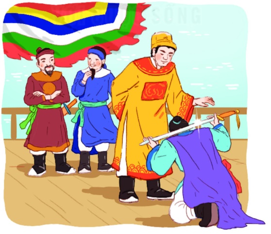 Nói xong, cậu tự đặt thanh gươm lên gáy, xin chịu tội.