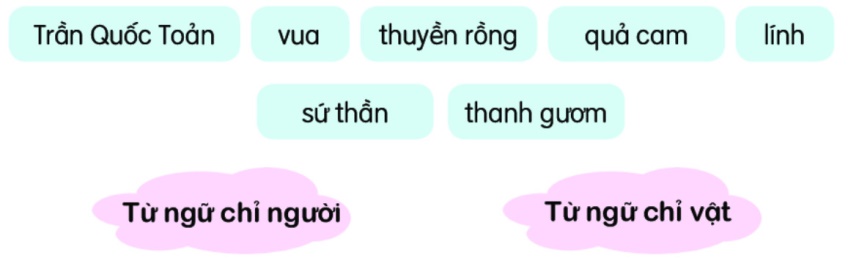 – Từ ngữ chỉ vật: thuyền rồng, quả cam, thanh gươm
