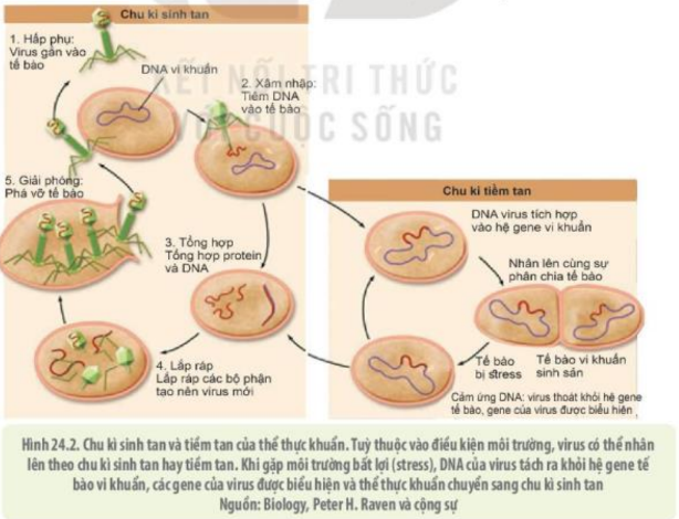 (5) Giải phóng: Virus thoát ra khỏi tế bào chủ. Khi đã vào được bên trong tế bào, các loại virus có thể nhân lên theo một trong hai cách được gọi là chu trình sinh tan hoặc chu kì tiềm tan hay sử dụng cả hai cách như thực khuẩn thể.