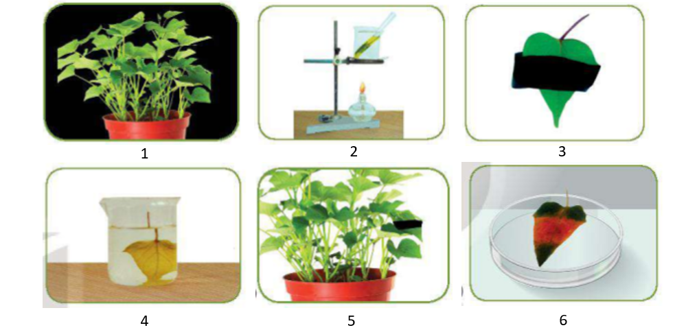 Các bước thí nghiệm chứng minh tinh bột được tạo thành trong quang hợp là: 1 → 5 → 3 → 2 → 4 → 6.
