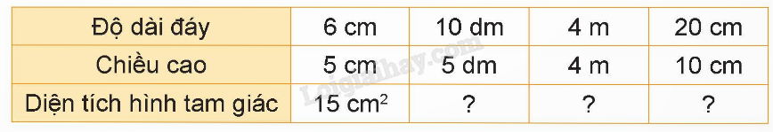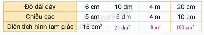 – Muốn tính diện tích hình tam giác ta lấy độ dài đáy nhân với chiều cao (cùng một đơn vị đo) rồi chia cho 2.