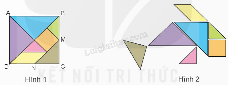 Mai tô màu một tờ giấy hình vuông cạnh 12 cm như hình 1 rồi cắt theo các vạch chia. Từ các mảnh giấy thu được, Mai ghép thành con cá như hình 2.