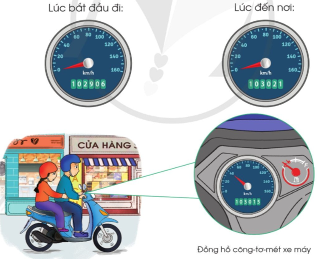 Quãng đường mà xe máy đó đã đi được = Số trên đồng hồ công-tơ-mét lúc đến nơi – Số trên đồng hồ công-tơ-mét lúc bắt đầu đi