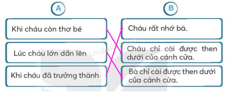 Dựa vào bài đọc, nối ý ở cột A phù hợp với nội dung ở cột B. Sắp xếp các bức tranh theo thứ tự của 3 khổ thơ trong bài đọc. Đánh dấu vào ô trống dưới từ chỉ hoạt động. Nối những từ chỉ hoạt động có thể kết hợp với từ cửa. Viết một câu về nhân vật em thích trong câu chuyện Bà cháu.