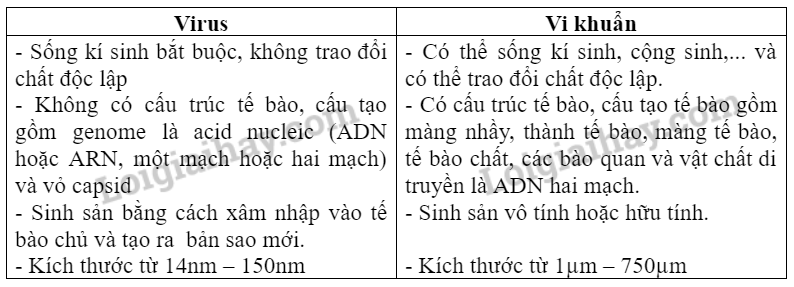 So sánh các đặc điểm khác nhau của virus và vi khuẩn: