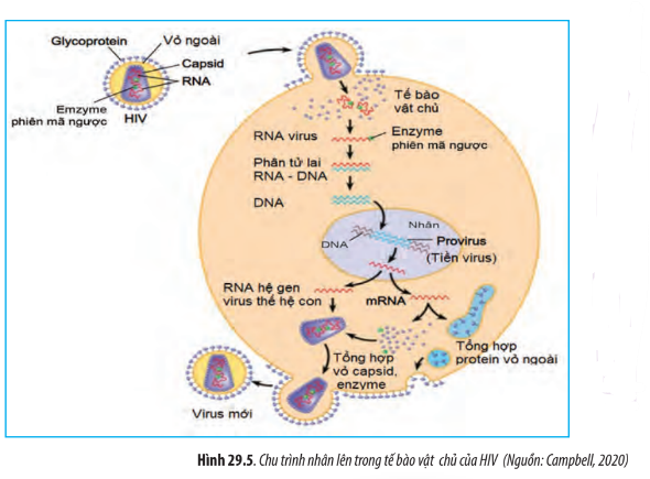 Câu 5: Quan sát Hình 29.5, hãy mô tả quá trình nhân lên của HIV trong tế bào vật chủ.