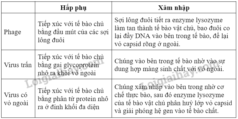 Dựa vào sự khác nhau về phân tử bề mặt tiếp xúc với tế bào vật chủ để phân biệt quá trình hấp phụ và sự khác nhau về cách để đưa vật chất di truyền vào bên trong tế bào vật chủ để phân biệt quá trình xâm nhập vào tế bào vật chủ của các loại virus.