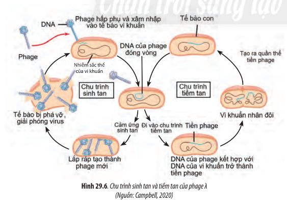 Quan sát Hình 29.6, hãy trình bày mối liên hệ giữa chu trình sinh tan và tiềm tan ở phage λ.