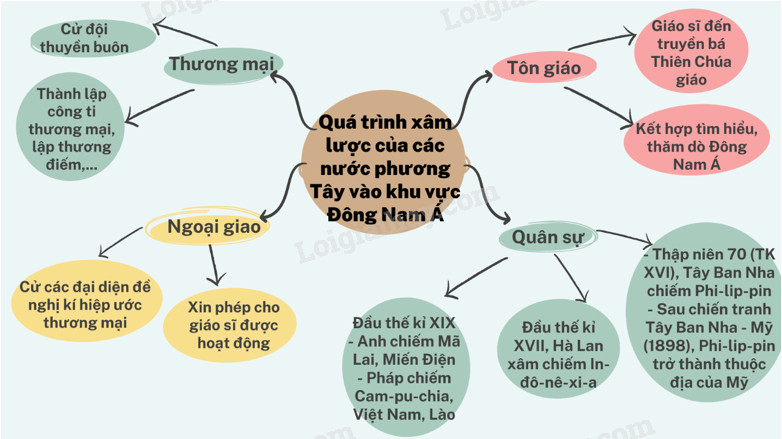 Vẽ sơ đồ tư duy về quá trình xâm nhập của tư bản phương Tây vào các nước Đông Nam Á từ thế kỉ XVI đến thế kỉ XIX.