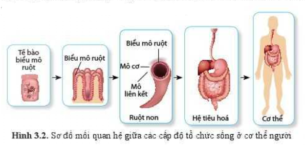 Các cấp độ tổ chức tạo nên hệ tiêu hoá trong cơ thể người: tế bào biểu mô ruột – biểu mô ruột – ruột non – hệ tiêu hoá – cơ thể.