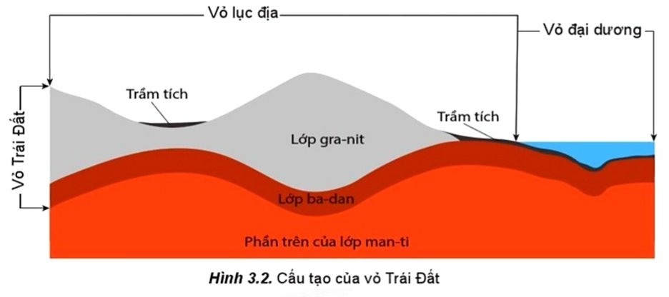 Đọc thông tin và quan sát hình 3.2, hãy trình bày đặc điểm của vỏ Trái Đất và các vật liệu cấu tạo vỏ Trái Đất.