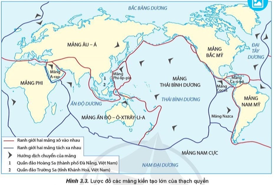 Quan sát hình 3.3 (Xác định vị trí của việt Nam, từ đó xác định được Việt Nam thuộc mảng kiến tạo nào).