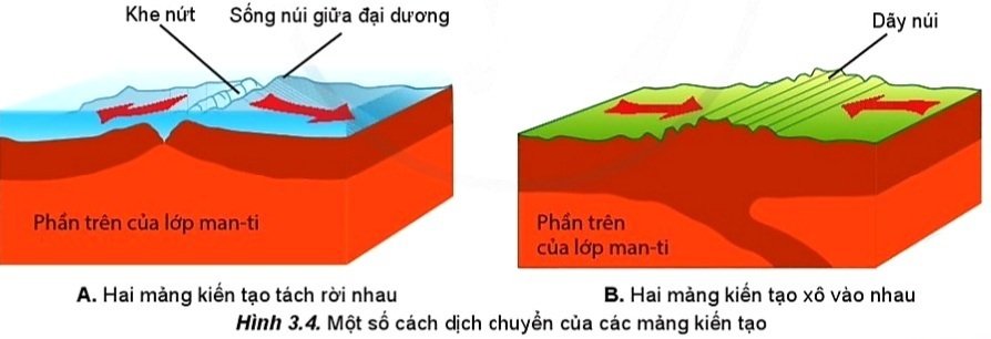Đọc thông tin mục 3 (thuyết kiến tạo mảng) và quan sát hình 3.3, 3.4 (chú ý sự di chuyển giữa 2 mảng kiến tạo).