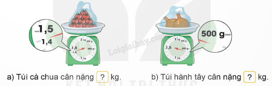 Đọc cân nặng của túi cà chua và túi hành tây rồi viết số thập phân thích hợp vào ô trống.