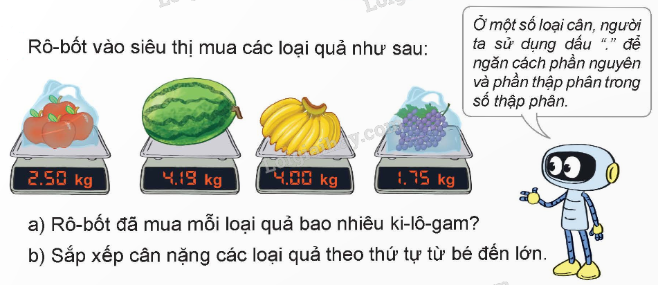a) Rô-bốt đã mua 2,5 kg táo, 4,19 kg dưa hấu, 4 kg chuối, 1,75 kg nho.