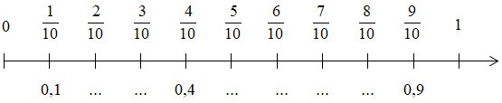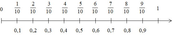 Dựa vào cách định nghĩa các số thập phân \(0,1 = \dfrac{1}{10}\) để viết các số thập phân ứng với mỗi vạch trên tia số.