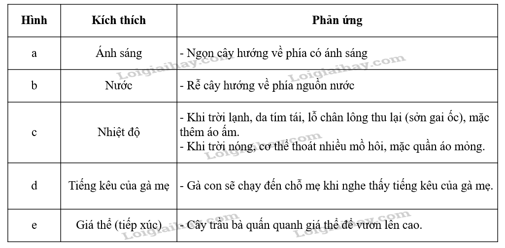 Quan sát Hình 33.1 và điền tên các kích thích minh họa vào cột Kích thích và mô tả phản ứng mà cây trả lời vào cột Phản ứng.