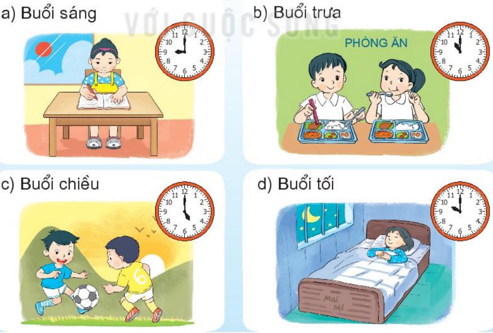 Quan sát đồng hồ ở mỗi bức tranh rồi trả lời câu hỏi đề bài.