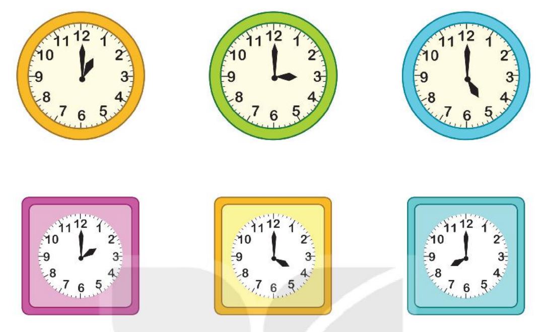 Quan sát đồng hồ rồi đọc thời gian thích hợp cho mỗi bức tranh.