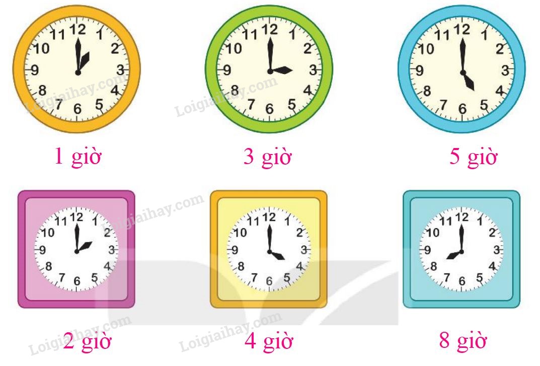 Quan sát kim giờ và kim phút trên mỗi đồng hồ đang chỉ vào số nào, từ đó đọc giờ trên đồng hồ đó.
