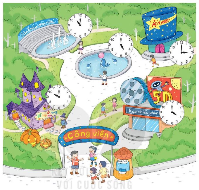 Quan sát đồng hồ rồi đọc thời gian thích hợp cho mỗi bức tranh.