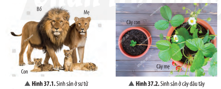 1. Quan sát Hình 37.1 và 37.2, em có nhận xét gì về số lượng bố mẹ tham gia sinh sản, đặc điểm cơ thể con ở sư tử và cây dâu tây? Lấy ví dụ về sinh sản một số sinh vật khác.