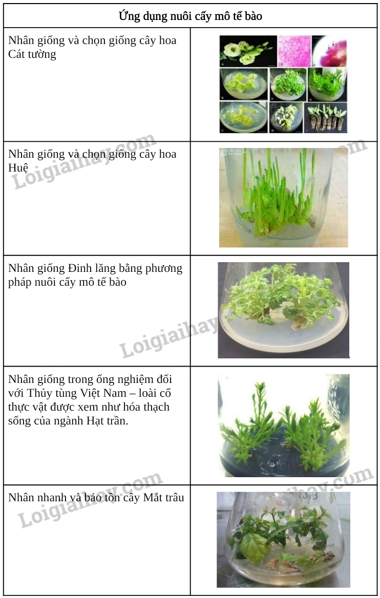 – Nuôi cấy mô: Cây thuốc lá, cây khoai môn, cây cà phê, cây tùng bách,…